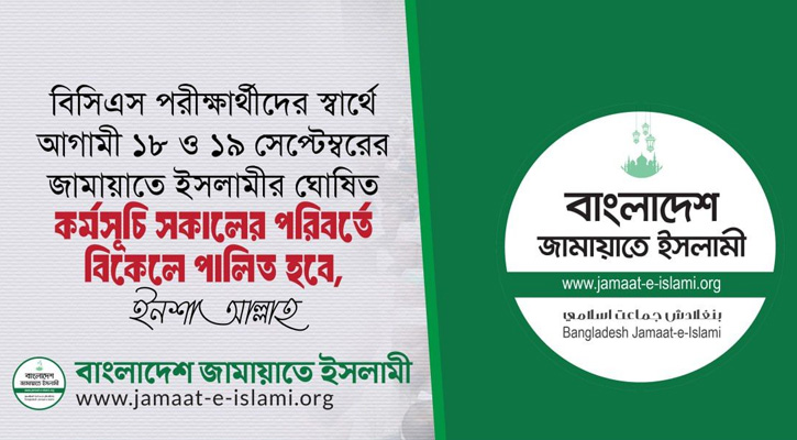 বিসিএস পরীক্ষার্থীদের ভোগান্তি এড়াতে ১৮ ও ১৯ সেপ্টেম্বরের ঘোষিত কর্মসূচির সময় পরিবর্তন করেছে বাংলাদেশ জামায়াতে ইসলামী। সকাল থেকে পরিবর্তন করে কর্মসূচি ওই দুইদিন বিকেলে পালনের সিদ্ধান্ত নিয়েছে দলটি।